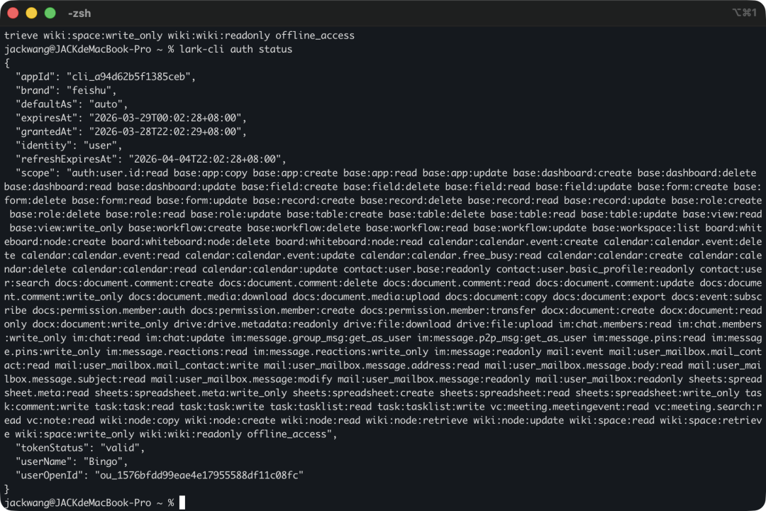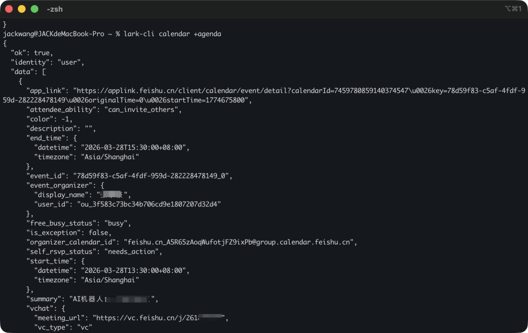 如果能输出你的今日日程,说明lark-cli环境搭建完成。