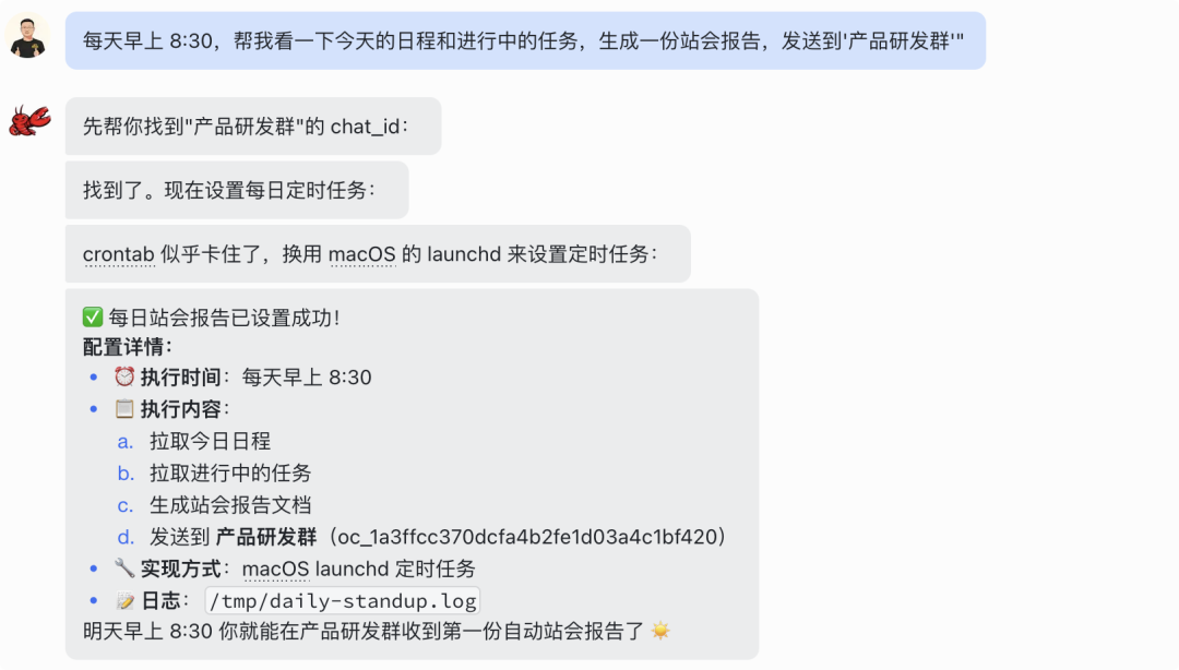 "每天早上8:30,帮我检查今天的日程,列出进行中的任务,生成一份站会报告,发送到'产品研发群'"
