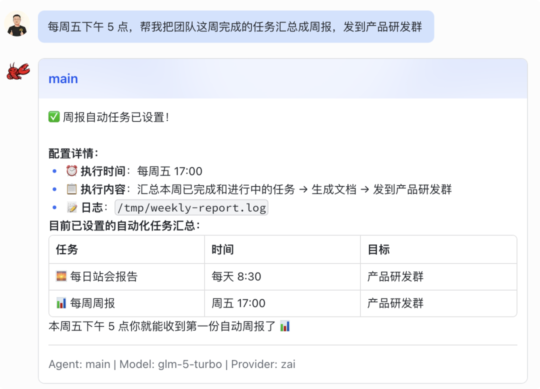 "每周五下午5点,帮我收集团队成员本周完成的任务,汇总成周报,发到'管理层群'"