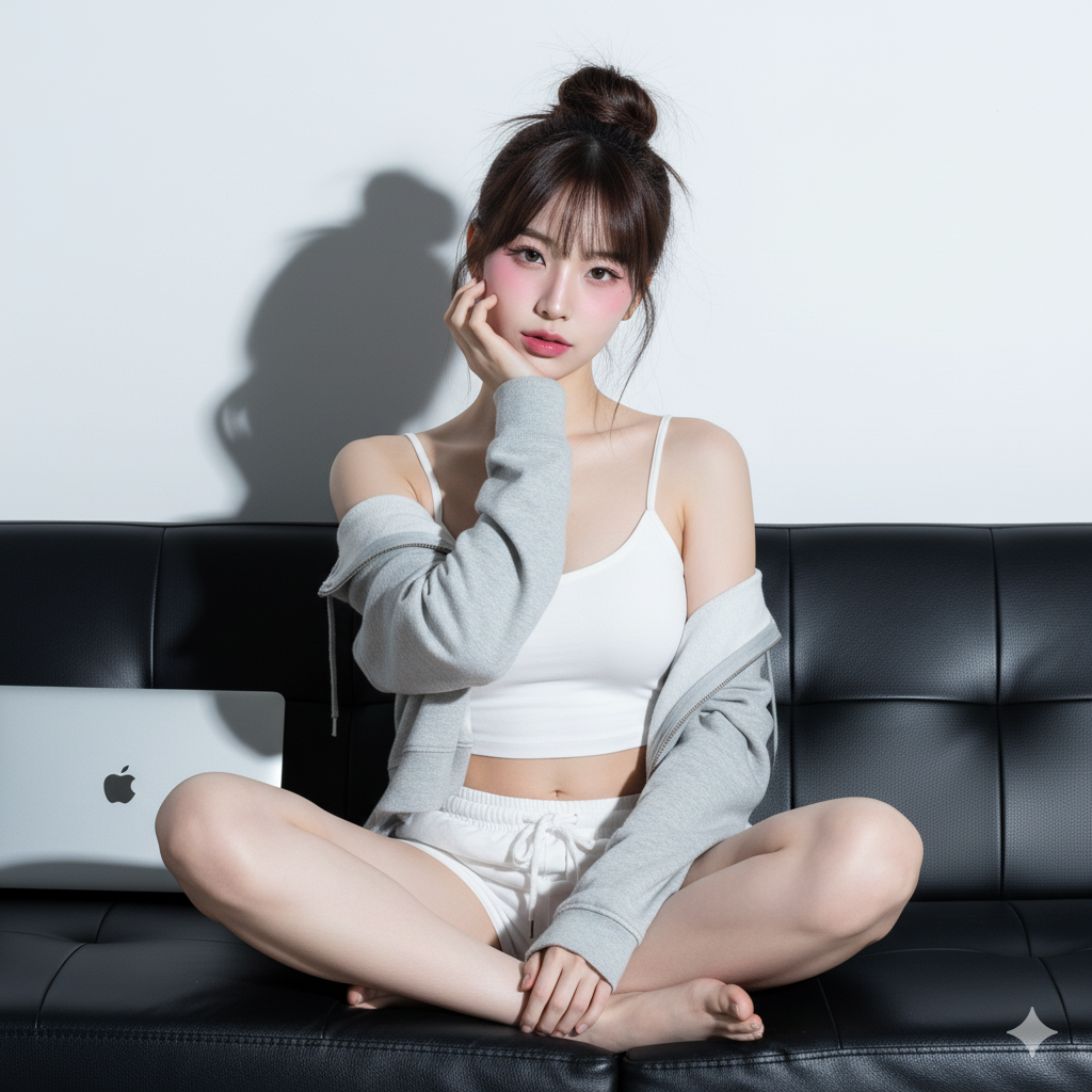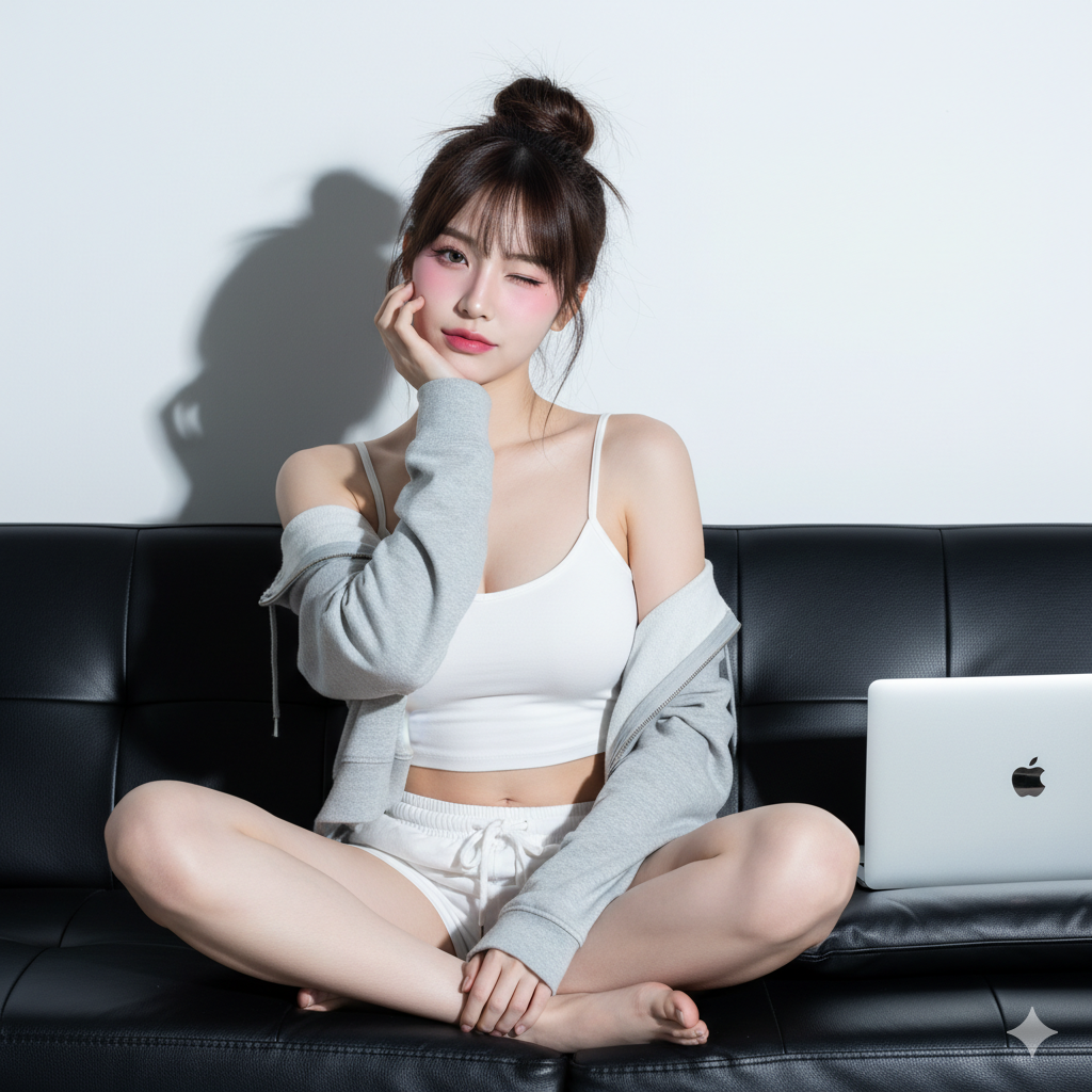 画一幅东亚年轻女性的高调工作室肖像照。她穿着白色吊带背心、白色短裤和敞开的灰色连帽衫,随意地坐在黑色皮沙发上。她的深棕色长发扎成凌乱的高丸子头,留着法式刘海。她的右眼直视镜头,左眼俏皮地眨着。右手托着下巴,指尖轻触脸颊,脸上是俏皮又迷人的表情。她的肤色非常白皙,妆容是流行的K-Beauty/抖音风格,脸颊有明显的粉色腮红,嘴唇是粉色渐变,眉毛清晰,眼线清淡,卧蚕突出,左眼下方还有一颗小痣。