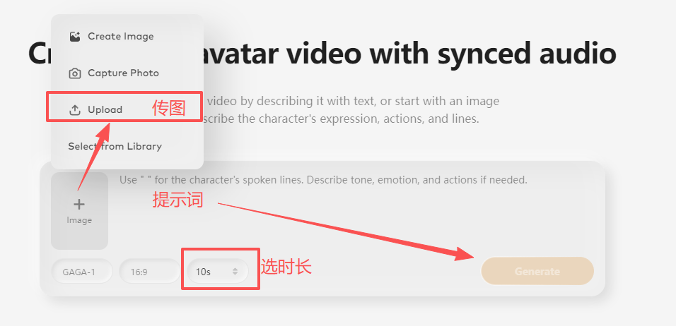 上传一张图片(或者用AI直接生成首帧图),输入台词/提示词,选择参数
