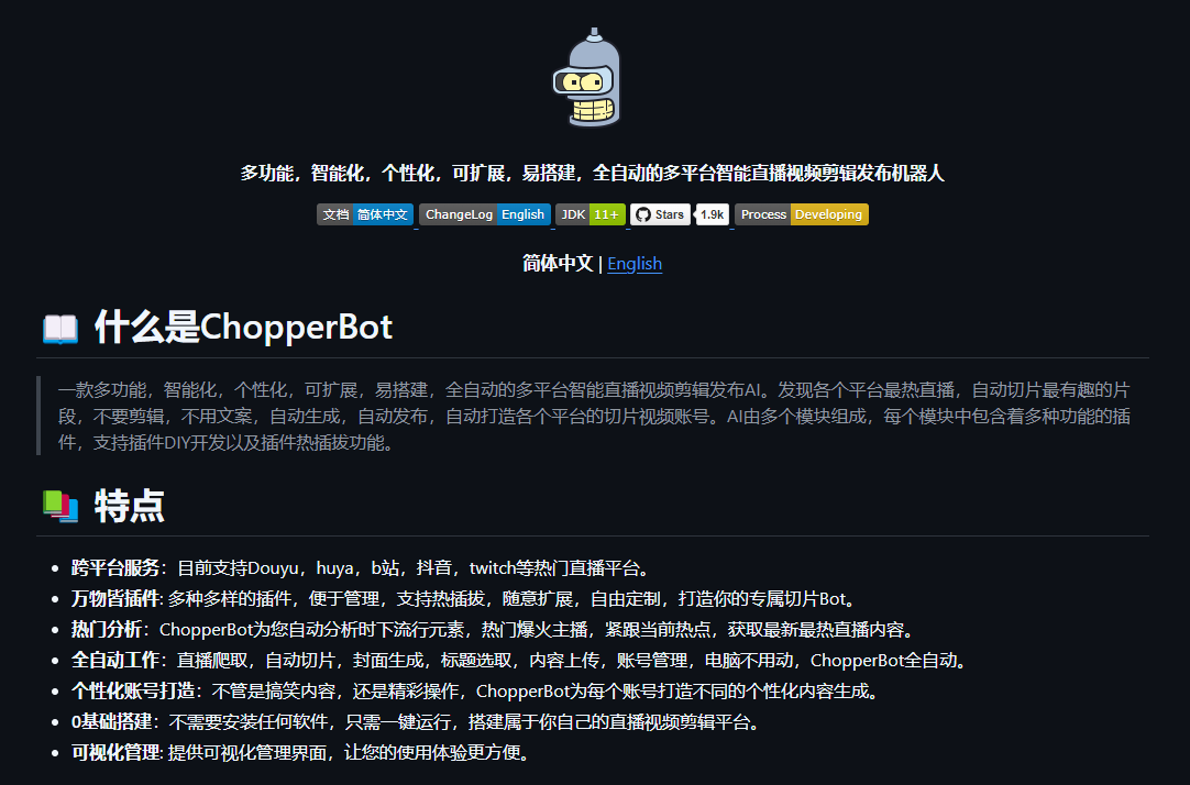 ChopperBot 是一个开源自动化视频剪辑和分发系统,它能自动发现热门直播内容、智能分析弹幕热度、生成视频片段和文案,最后自动发布到多个短视频平台。