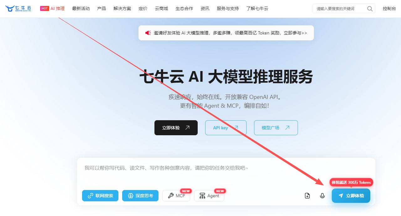 除了上面领到的1000万 Token,这里还有300W Token可以领,就是直接在官网首页点「AI推理」,输入了一个问题或是小任务,执行一下就可以了