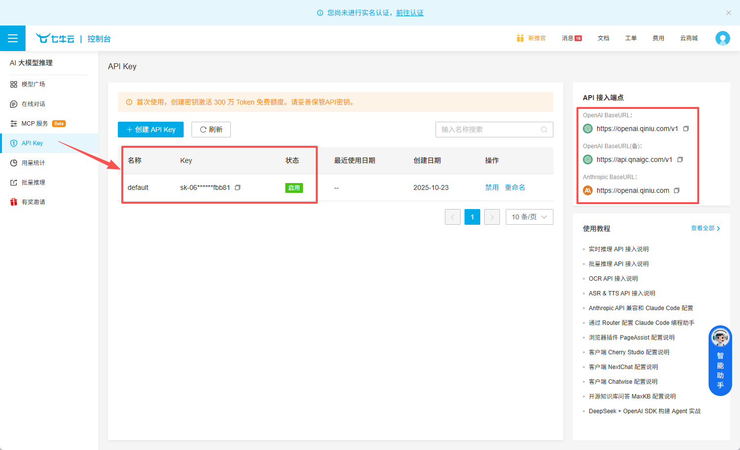 七牛云控制台获取API Key:https://portal.qiniu.com/ai-inference/api-key