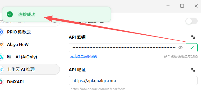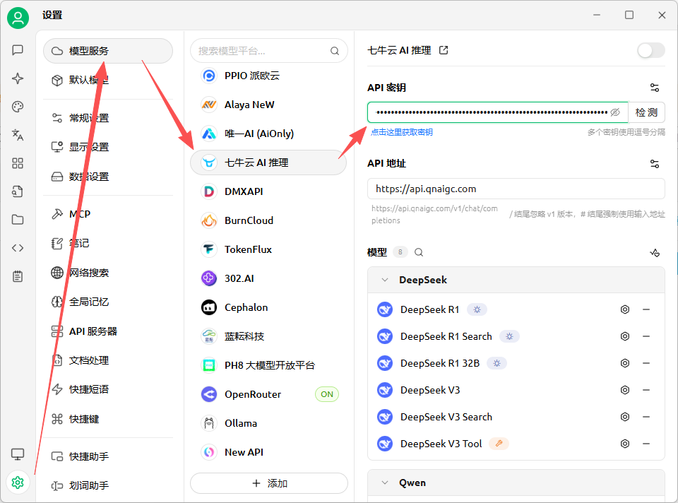 打开Cherry Studio,直接进入「设置」界面 - 「模型服务」- 「七牛云AI推理」,填入KEY