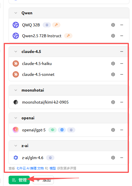如果默认的模型列表没有你想要的,可以在「管理」里面添加(不是直接点添加)