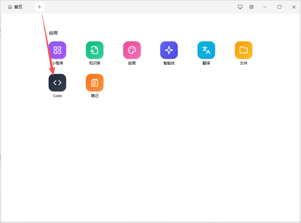 点击Cherry Studio顶部菜单的「+」号,进入并找到「Code」工具