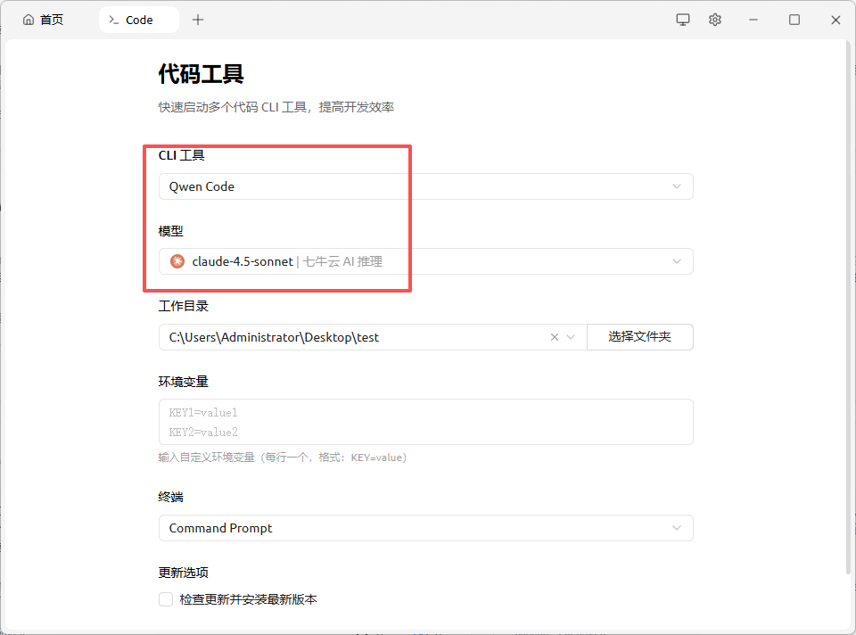 进入后「CLI工具」就选Qwen Code,这个是支持七牛云的Claude 4.5模型,选好后配置其他参数,最后点「启动」即可
