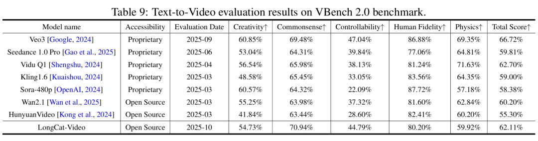 LongCat-Video 的模型评估围绕内部基准测试和公开基准测试展开,覆盖 Text-to-Video(文本生成视频)、Image-to-Video(图像生成视频)两大核心任务,从多维度(文本对齐、图像对齐、视觉质量、运动质量、整体质量)验证模型性能: