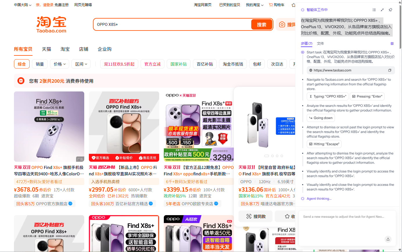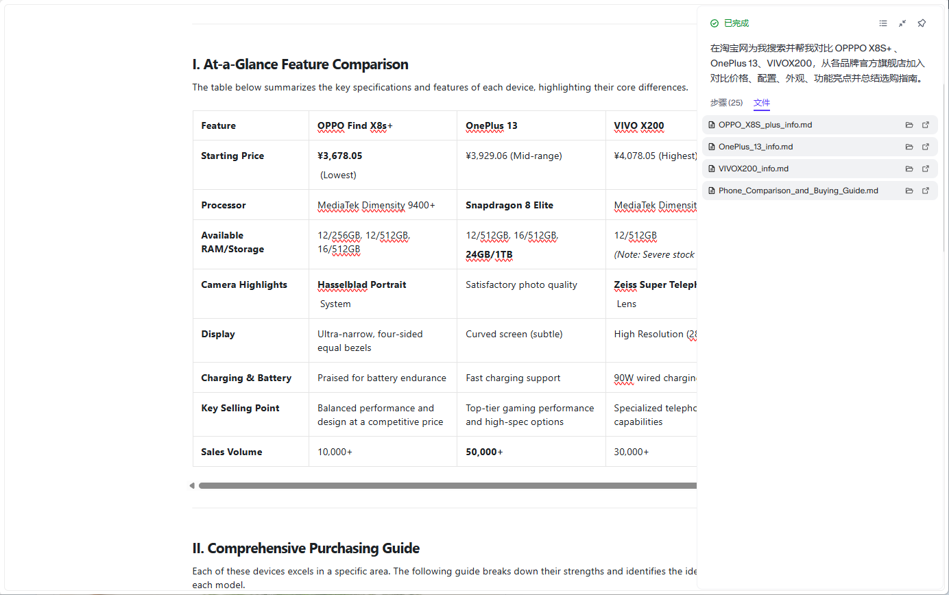 “在淘宝网为我搜索并帮我对比 OPPPO X8S+ 、OnePlus 13、VIVOX200,从各品牌官方旗舰店加入对比价格、配置、外观、功能亮点并总结选购指南。”