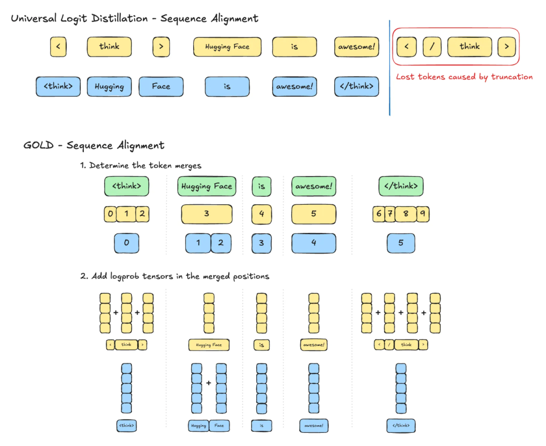 词汇对齐:先找出两个分词器中相同的 token(即使 ID 不同),对这些 token 使用直接映射;对无法匹配的部分,才回退到 ULD 的排序方法。最终损失函数结合两部分:L_GOLD = w1 * L_GKD + w2 * L_ULD