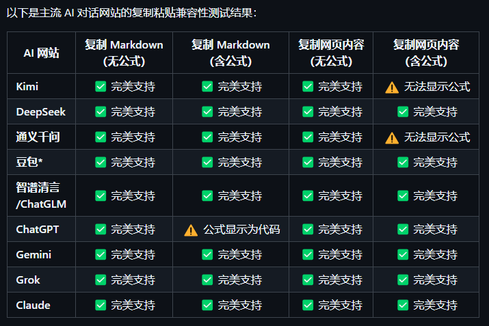 - 学术写作场景:从 ChatGPT、Perplexity 等 AI 工具复制参考文献、数据表到论文中,公式能正确显示