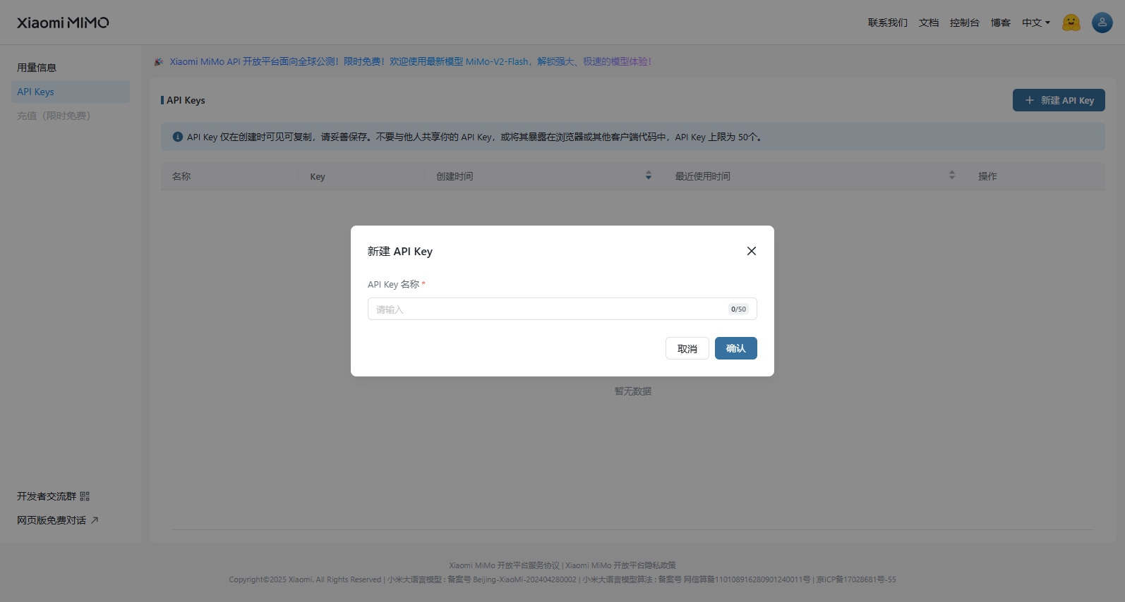 登录/注册(有小米账号直接可登录使用)密钥获取获取免费 API Key。