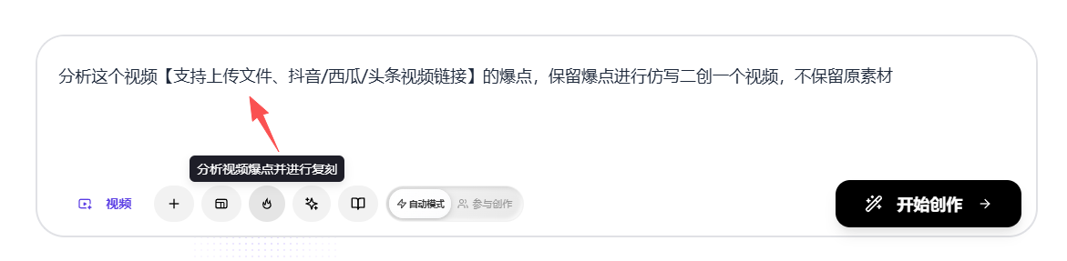 文本或链接输入:可直接输入视频描述,或贴抖音/小红书链接进行“创意拆解”。