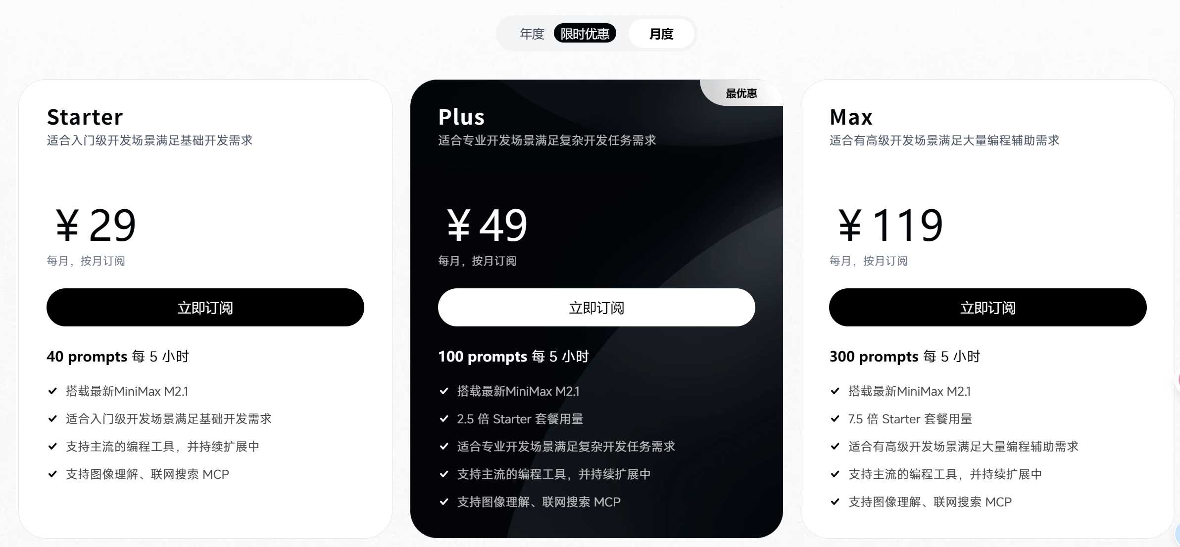 MiniMax Plus 套餐:49 元,提供 100 次 prompt 调用。对高频用户而言额度偏紧,容易超额。