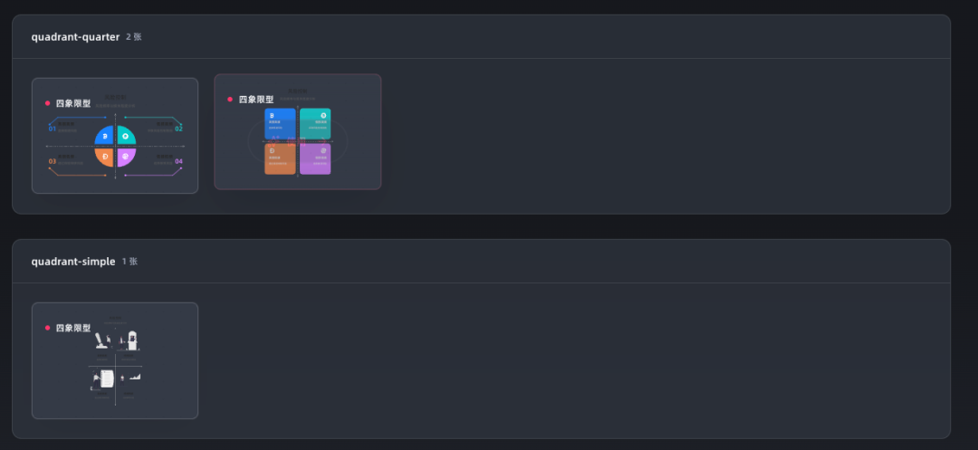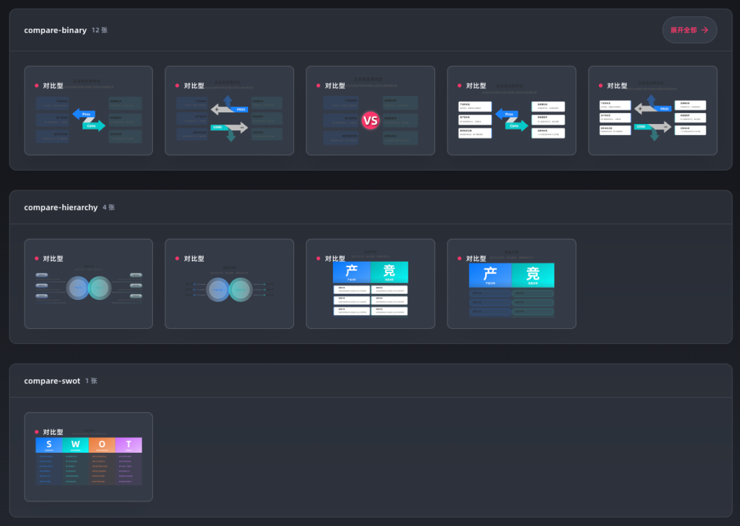 与 ECharts 等通用图表库不同,它的设计目标是让用户用更直观的方式描述信息的层级关系、流程顺序、对比维度等逻辑结构,然后由引擎自动完成布局和渲染。