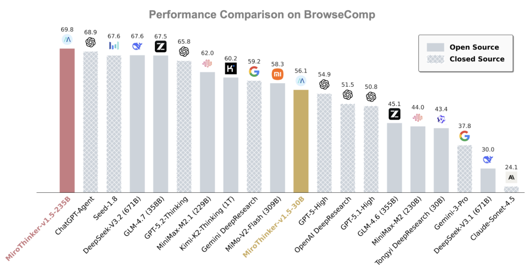 MiroThinker在BrowseComp等标准测试基准上的表现值得关注: