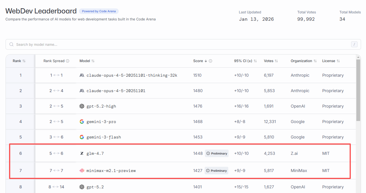 如果不懂是什么段位,那么直接看 WebDev Leaderboard 这个榜单,MiniMax M2.1 拿到 1448 分,排第六;GLM-4.7 是 1427 分,排第七。这个成绩,放在现在的模型环境里,对比前几名,已经可以说明实力了。