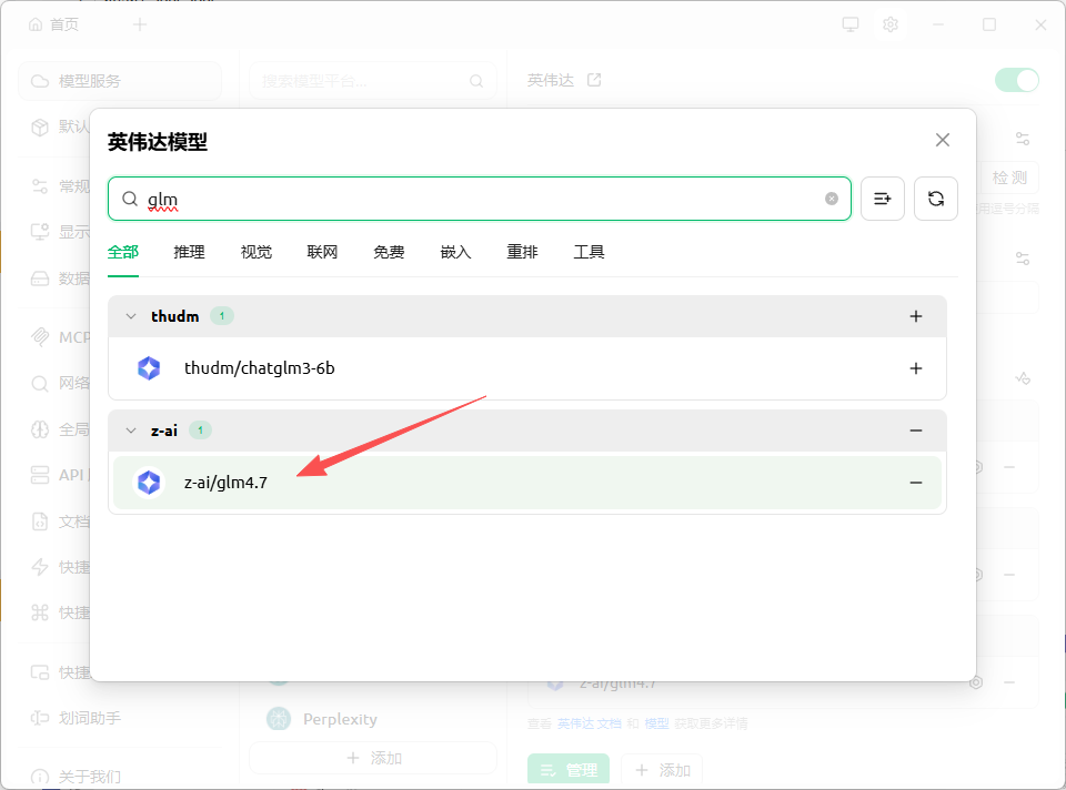 默认模型只有英传达和LLM的模型,可以在管理搜索并添加