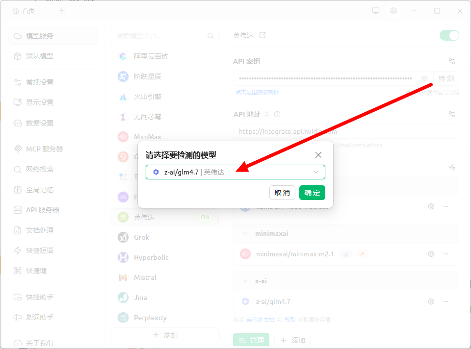 找到模型服务 - 英伟达,填入Keys