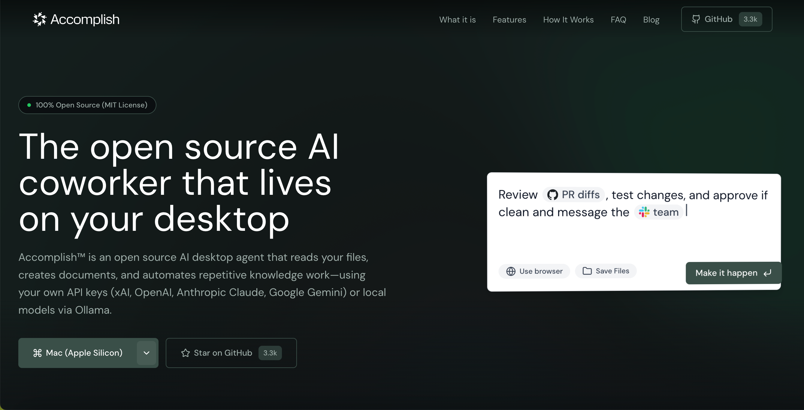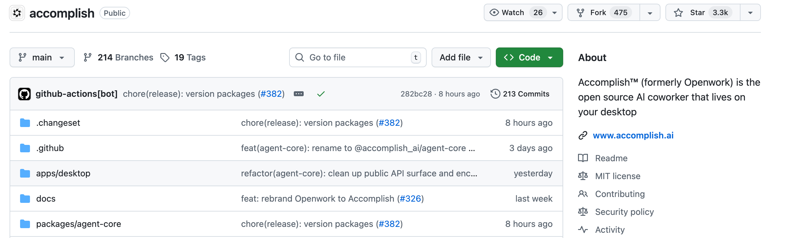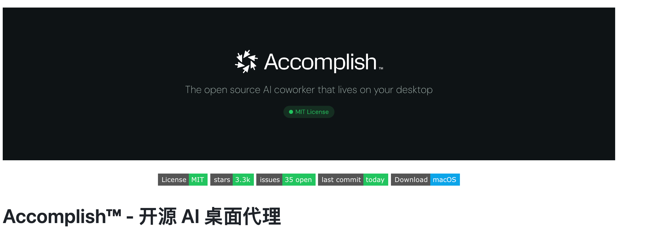 直到我发现了GitHub上的Accomplish项目,这个由开发者在2天内完成的开源方案,打破了我的这个疑问。目前已获得3.3K标星,更重要的是,它在多个维度上超越了商业对标产品。