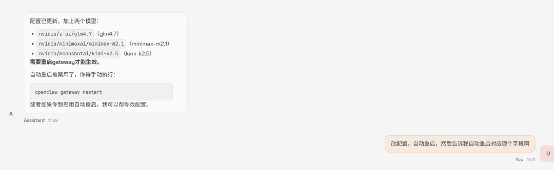 重启服务:"配置改完了,帮我重启一下"