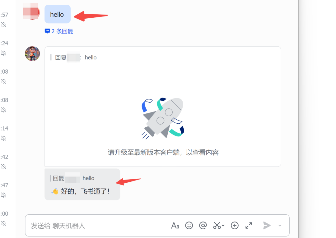 验证连接:在飞书中给 Bot 发送一条消息,验证是否连接成功
