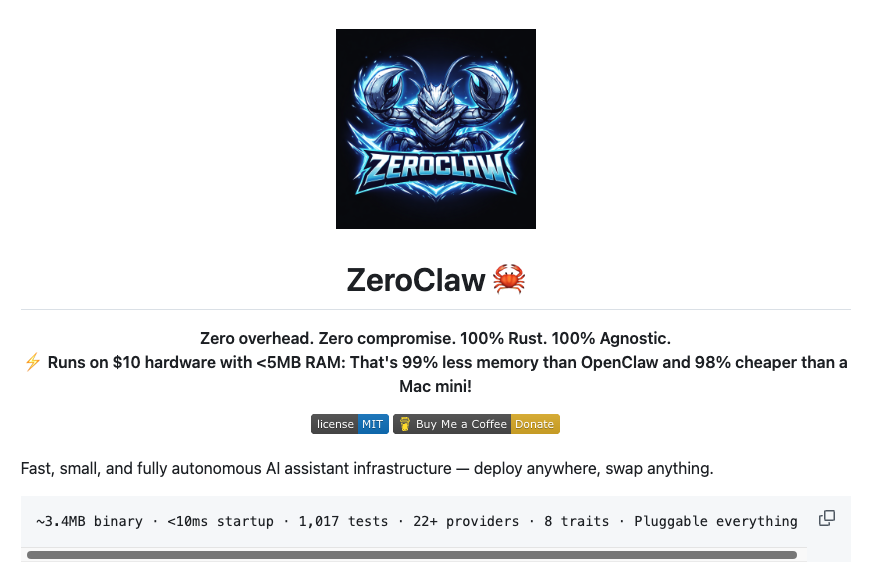 ZeroClaw是一个用Rust编写的开源AI Agent框架,专注于在资源受限的环境中部署和运行智能助手。