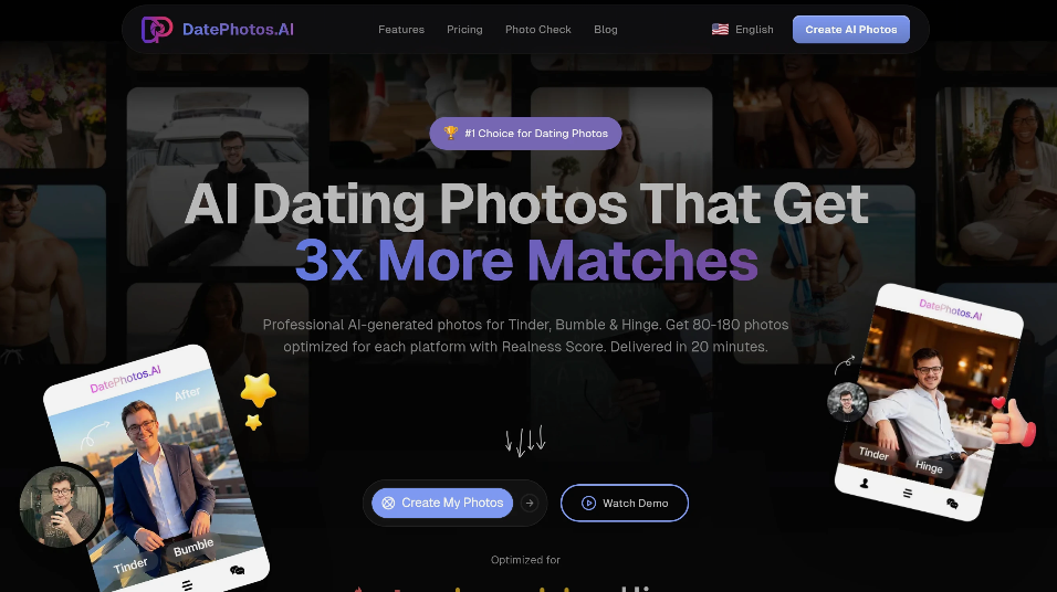 - 20分钟快速交付:上传照片后,只需20-30分钟即可获得80-180张为约会平台优化的AI照片,省时高效。