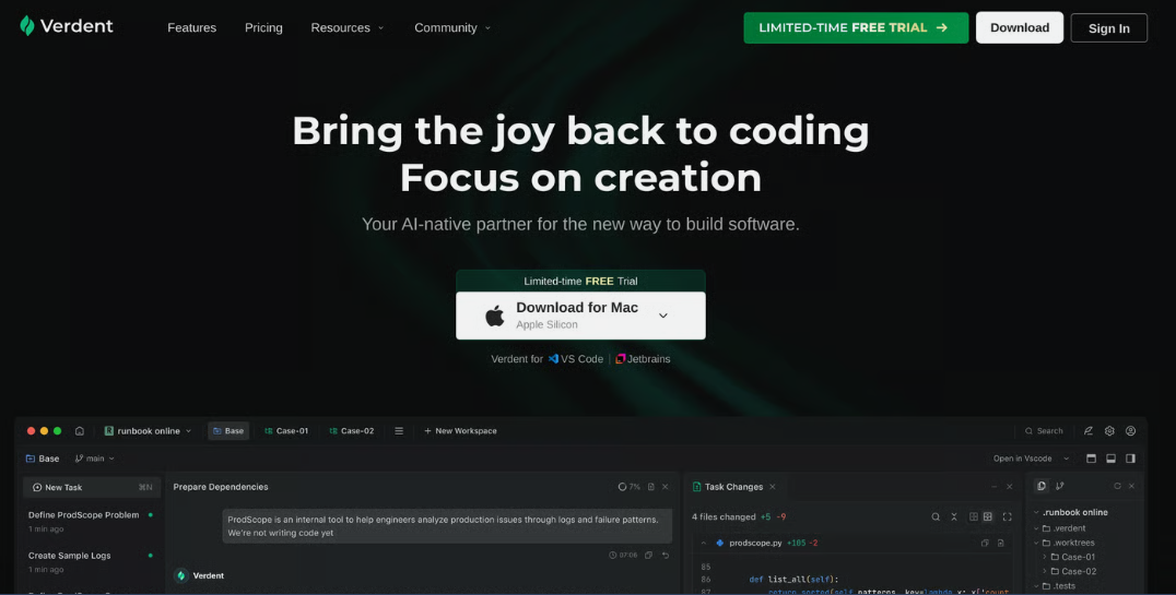 Verdent是一款为软件开发人员设计的 AI编码工具。它通过多并行 Agent 帮助您专注于创作,从而提高开发效率。 它可以处理文档、数据分析、原型等任务,让您专注于代码。