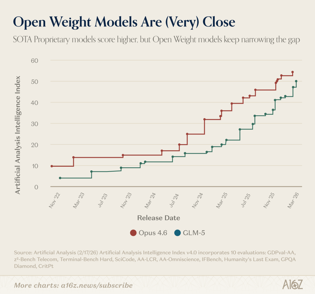 原文指出:A proprietary model (Claude Opus 4.6) is still the 'most intelligent,' but the gap between it and the next best open weight model has closed substantially.(链接:a16z)