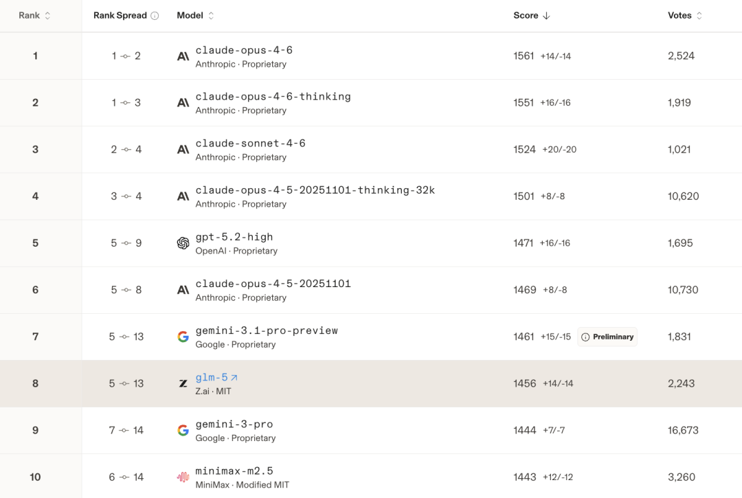 在 LMArena(原 Chatbot Arena)上,GLM-5 在文本与代码竞技场均为开源第一,整体与 Claude Opus 4.5、Gemini 3 Pro 同档。