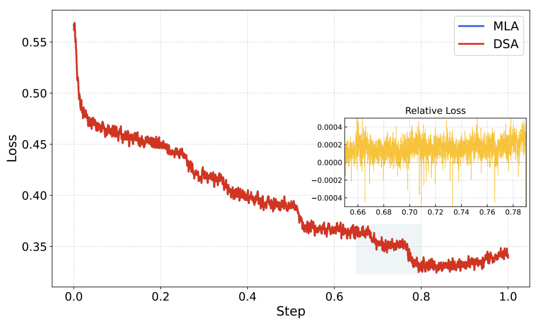 结果:DSA 模型在长上下文基准与原始 MLA 基本持平,SFT 训练损失曲线几乎重合。