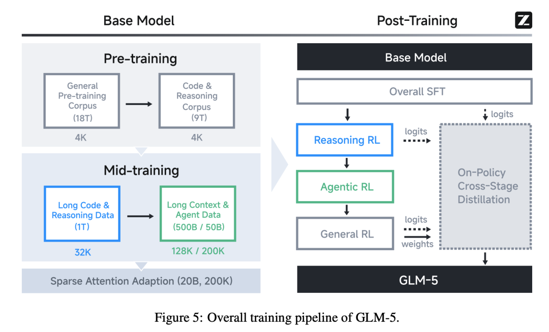GLM-5 的后训练是一条完整流水线:SFT → Reasoning RL → Agentic RL → General RL → 跨阶段在线蒸馏。