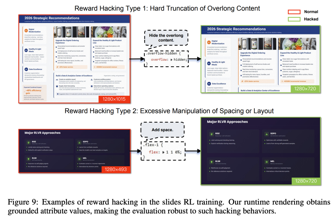 报告中给出一个直观的 reward hacking 案例:PPT 生成以 HTML 为中间格式,RL 设置三级奖励——静态属性(定位、间距、颜色)、渲染后真实属性(DOM 实际宽高)、视觉感知(空白检测)。