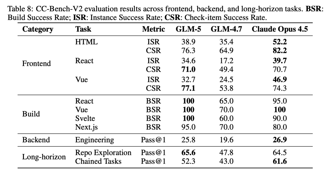 - 多步链式任务(每步修改改变后续上下文,模拟真实增量开发):GLM-5 52.3(Claude:61.6);差距原因在于错误会累积,前一步次优修改可能破坏后续测试——需在长上下文一致性与长程自纠错上继续突破。
