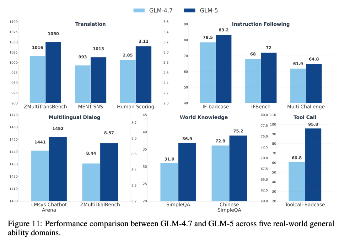 - 修正后,符合 16:9 比例的页面由 40% 提升至 92%;人工评估中,GLM-5 对比 GLM-4.5 综合胜率 67.5%。