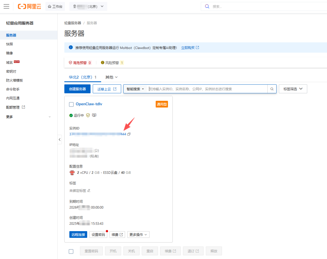 完成购买后,在控制台"实例列表"中找到新建的服务器实例