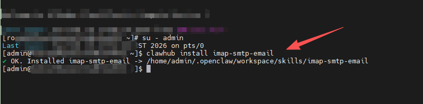npm i -g clawhub clawhub install imap-smtp-email - 系统会自动拉取并安装插件及其依赖