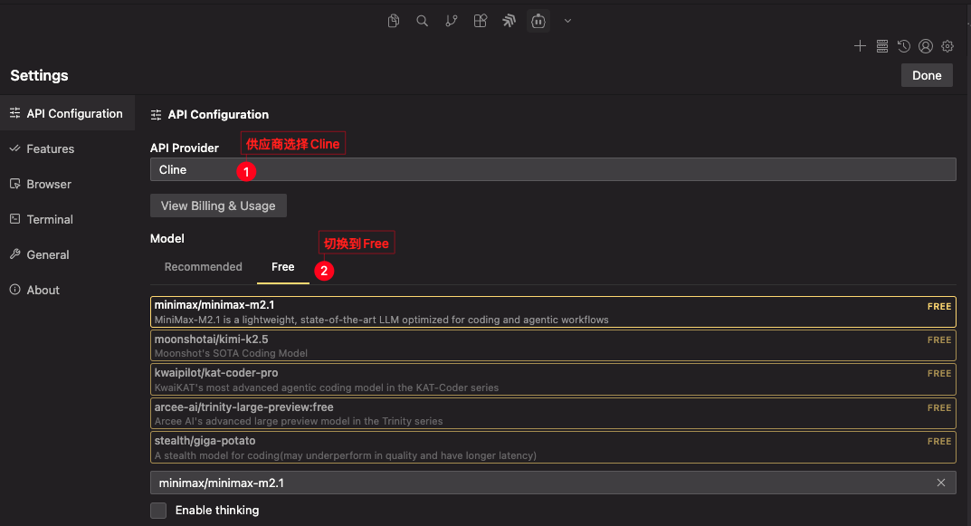 在 API Provider 选择「Cline」,Model 切到「Free」,即可看到可用免费模型