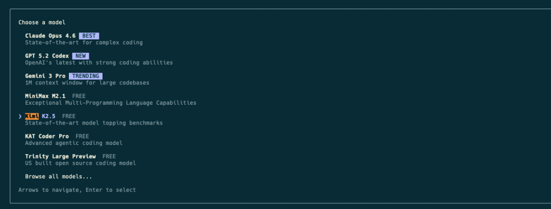 - 优势:Minimax‑m2.1、Kimi‑k2.5 均可直接免费体验;CLI 同步支持。