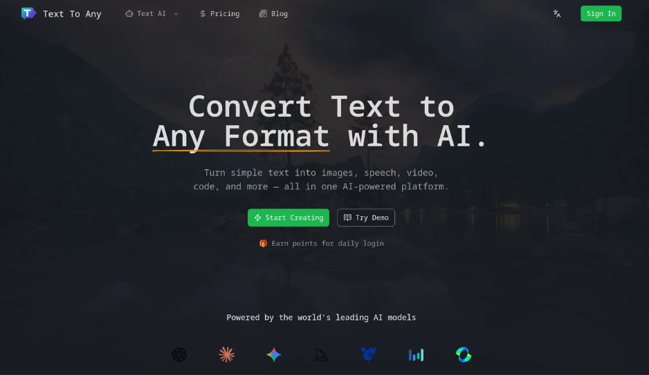 Text To Any是一款将文本转化为图像、语音、视频等多种形式的AI平台。用户只需输入文本,即可通过AI生成各种内容,满足不同场景需求。该平台拥有快速生成、高质量输出等特点,适用于内容创作、市场营销等领域。