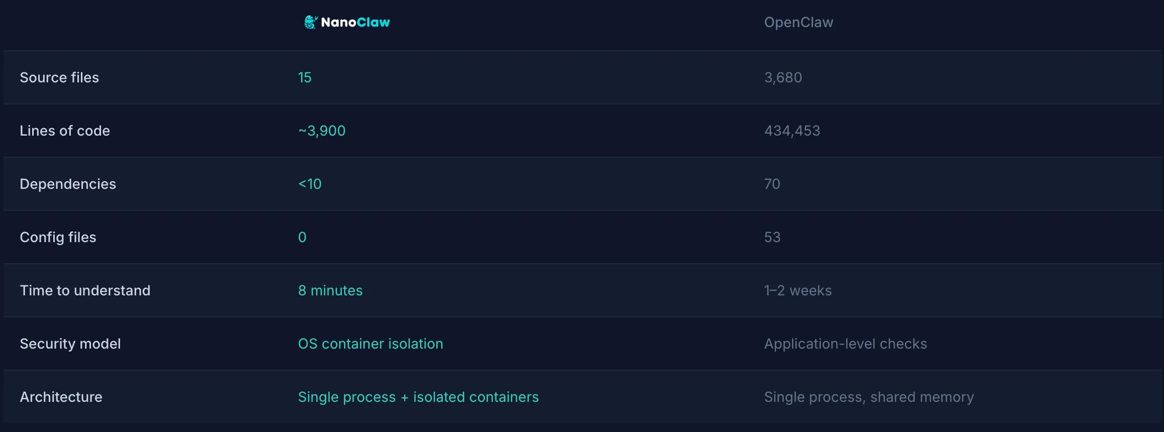 与 40 万行代码、配置和依赖如“高墙”般的 OpenClaw 相比,NanoClaw 的精与美扑面而来。