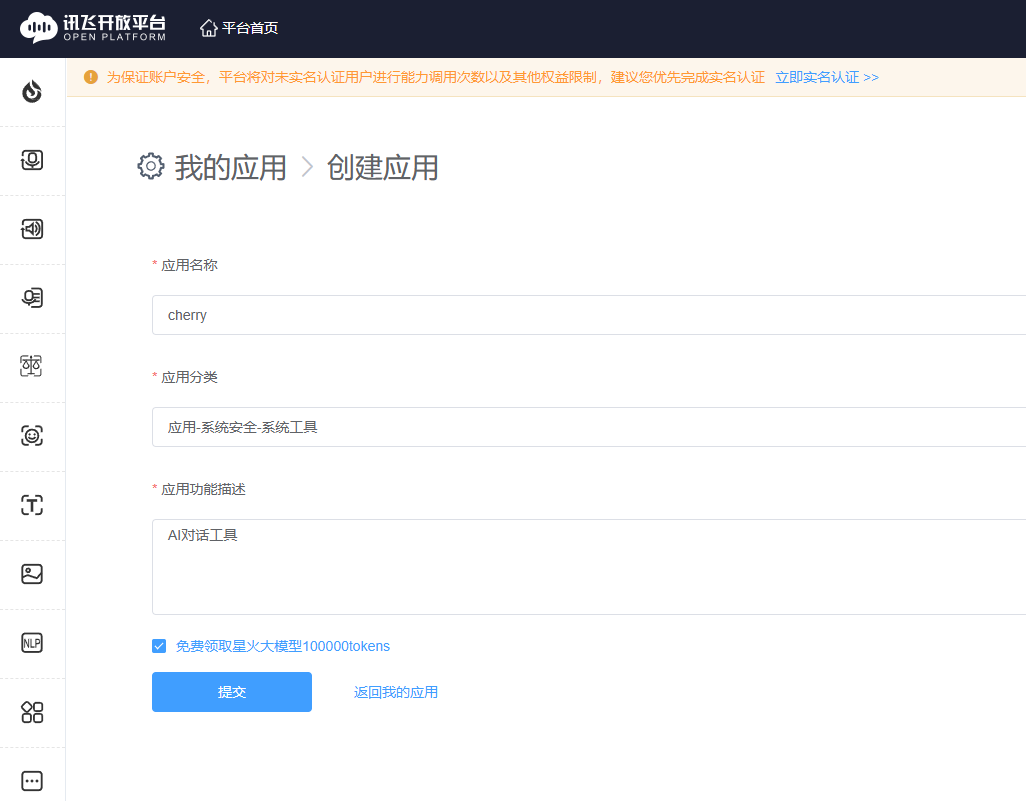 随便填写,创建应用