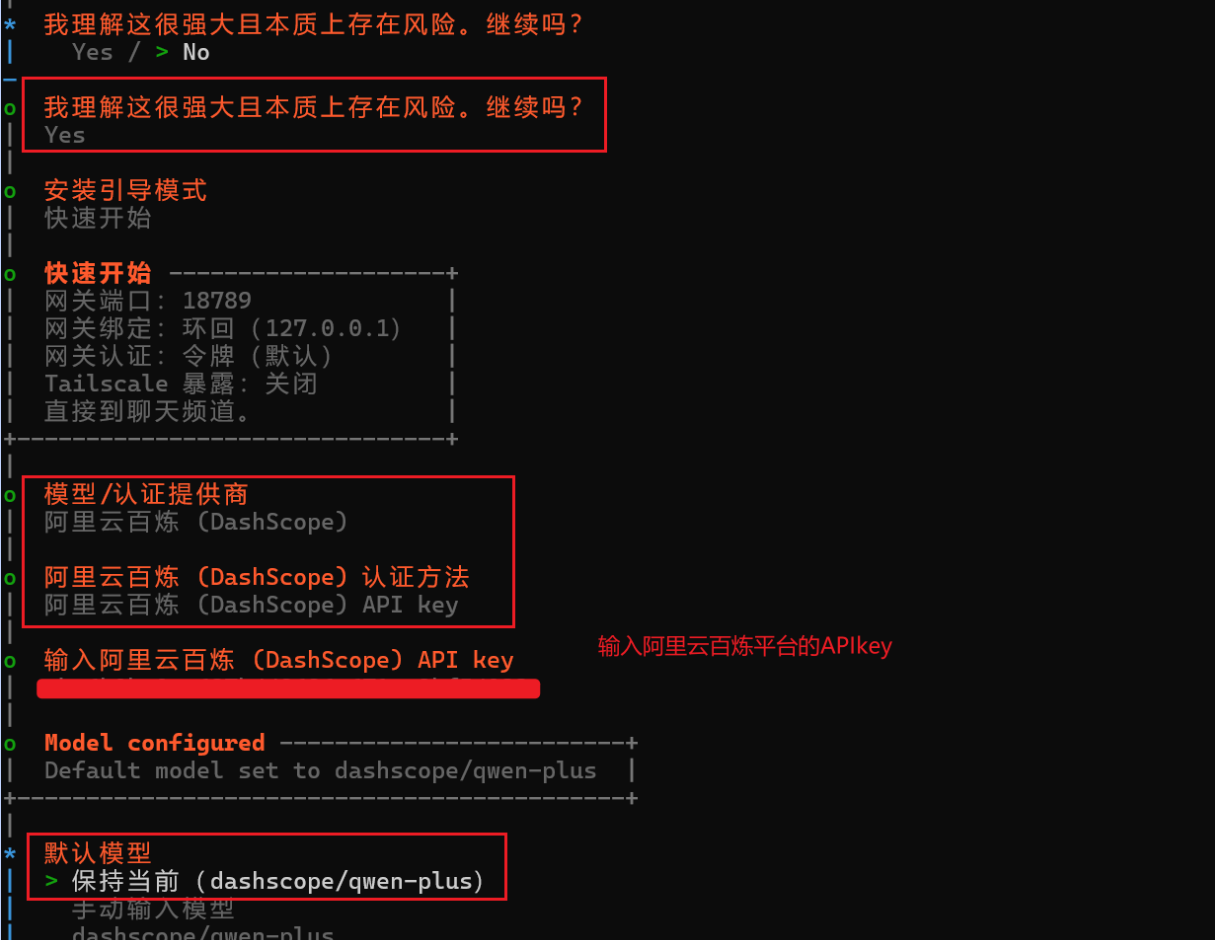 输入 API Key:系统将提示输入 API Key,此处要先跳过(原因是我实测了跟openclaw阿里云百炼配置方式不同,后面我会教如何修改)