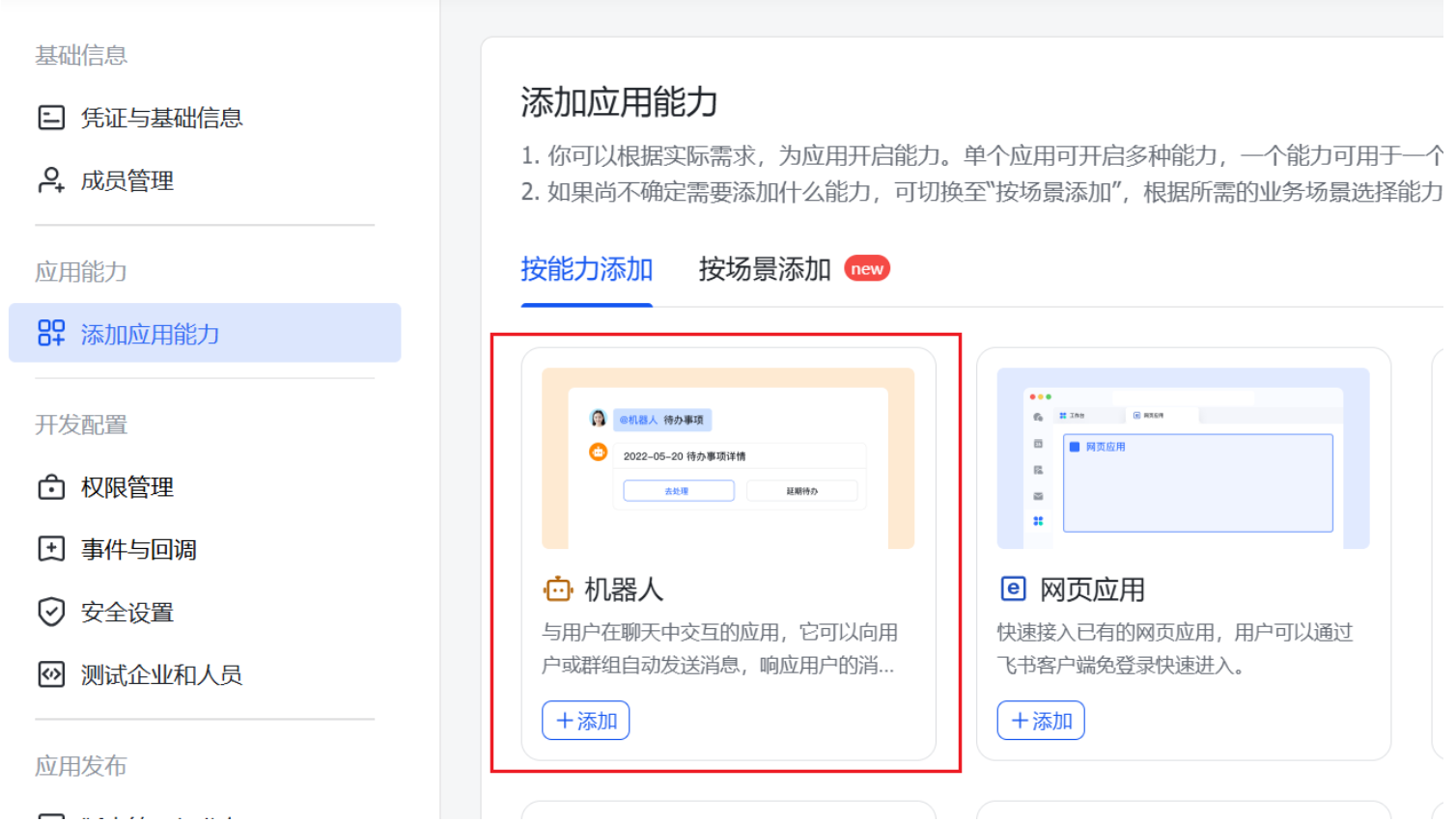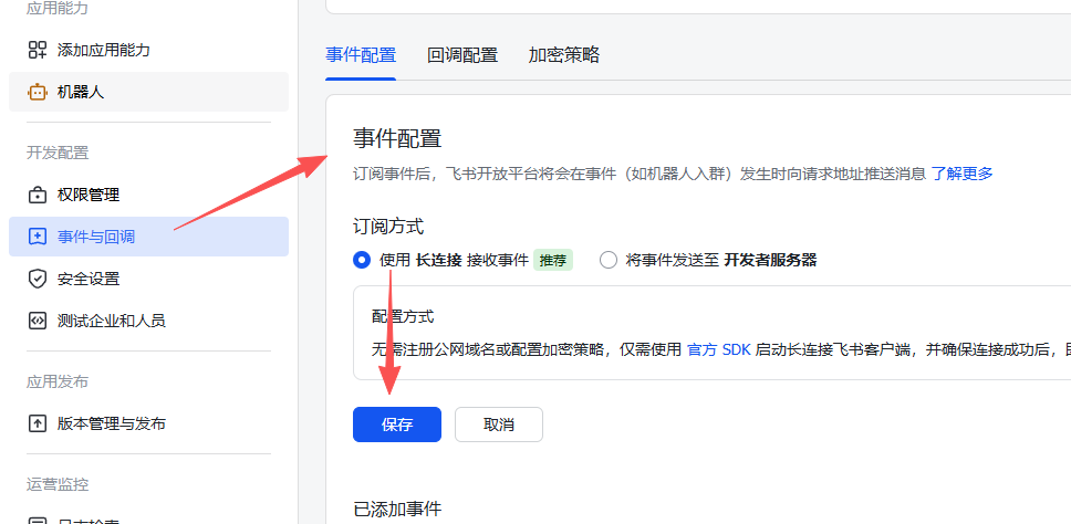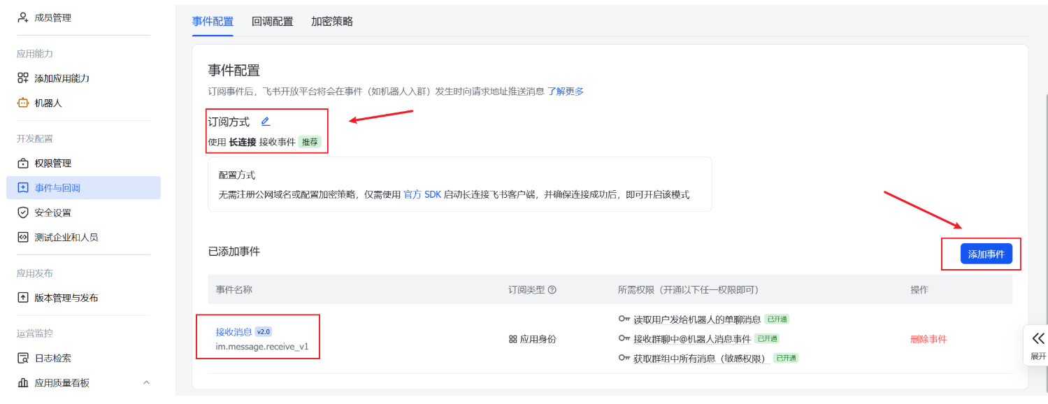 添加事件:至少需要订阅 im.message.receive_v1 (接收消息) 事件。