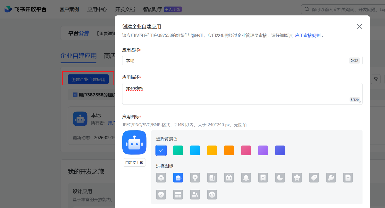 填写应用名称(如 "OpenClaw")和描述,完成创建。