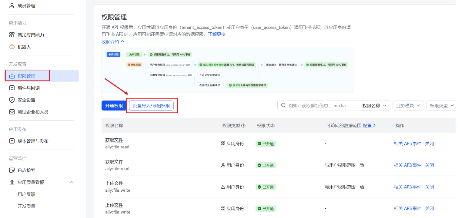 在应用管理页面,进入 权限管理 -> 批量导入/导出权限。