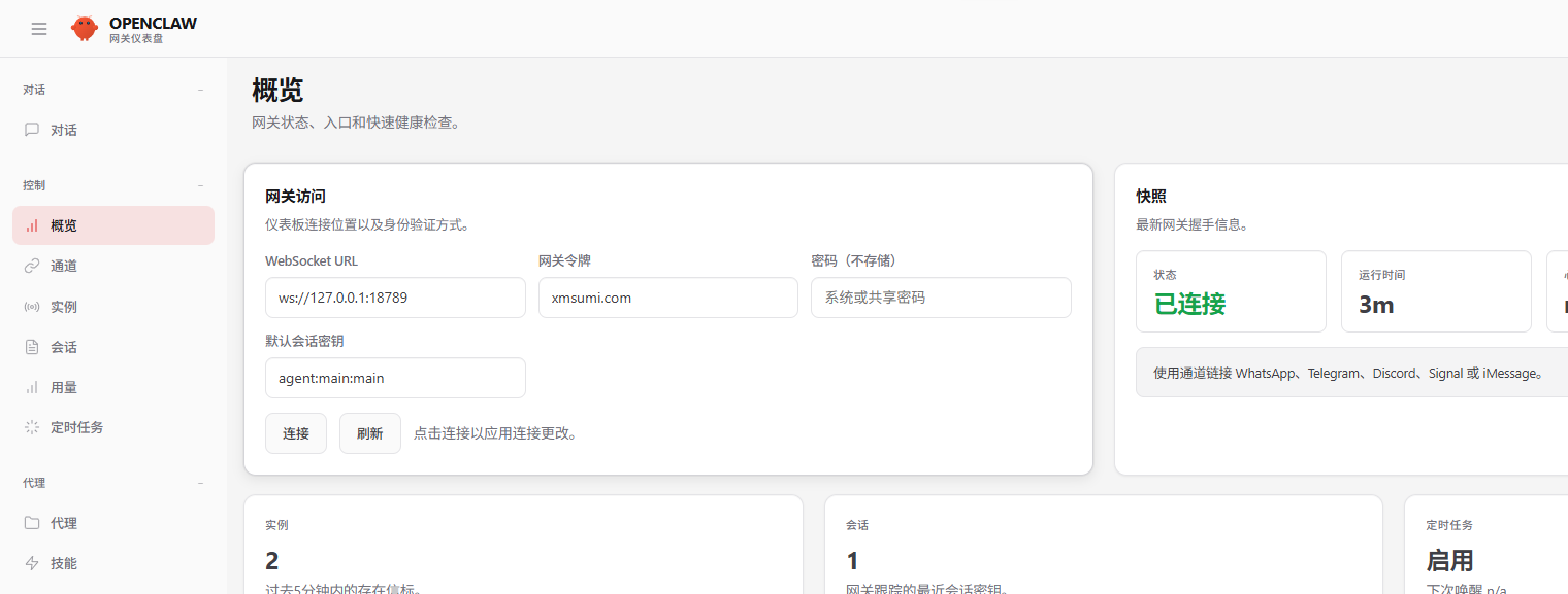 登录 OpenClaw 管理后台,这个时候中文版的OpenClaw 就运行成功啦!