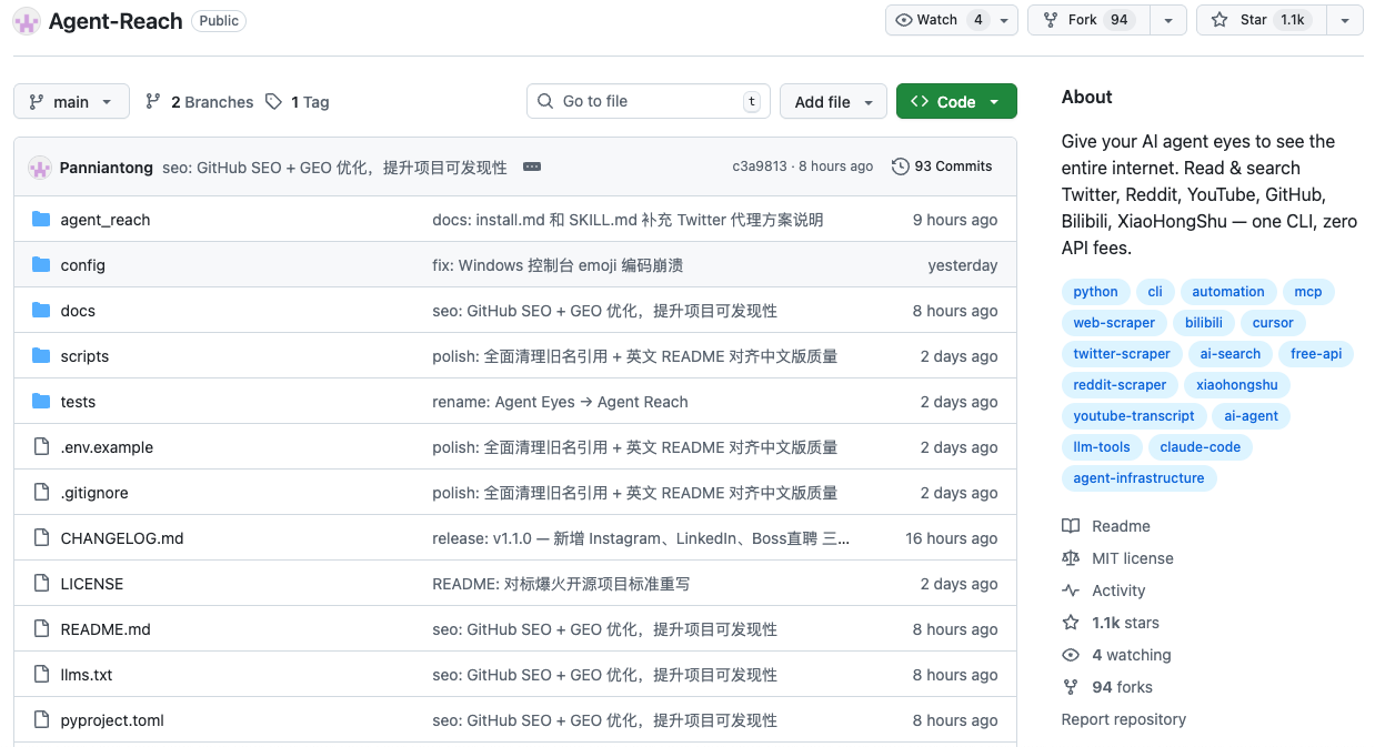项目在两天内获得1.1K+ Star的现象背后,反映了开发者社区对这类"工程化解决方案"的真实需求。无论你是日常使用AI Agent做各类任务,还是在开发Agent相关产品,Agent Reach都提供了一个开箱即用且高度可定制的工具集。